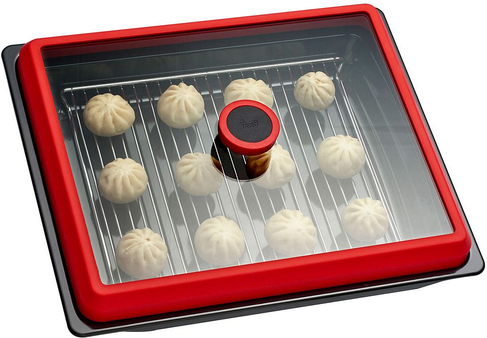 • 1 стеклянная крышка с силиконовыми уплотнителями и отверстием для вывода пара (позволяет готовить блюда на пару, если налить на дно основного противня воду)