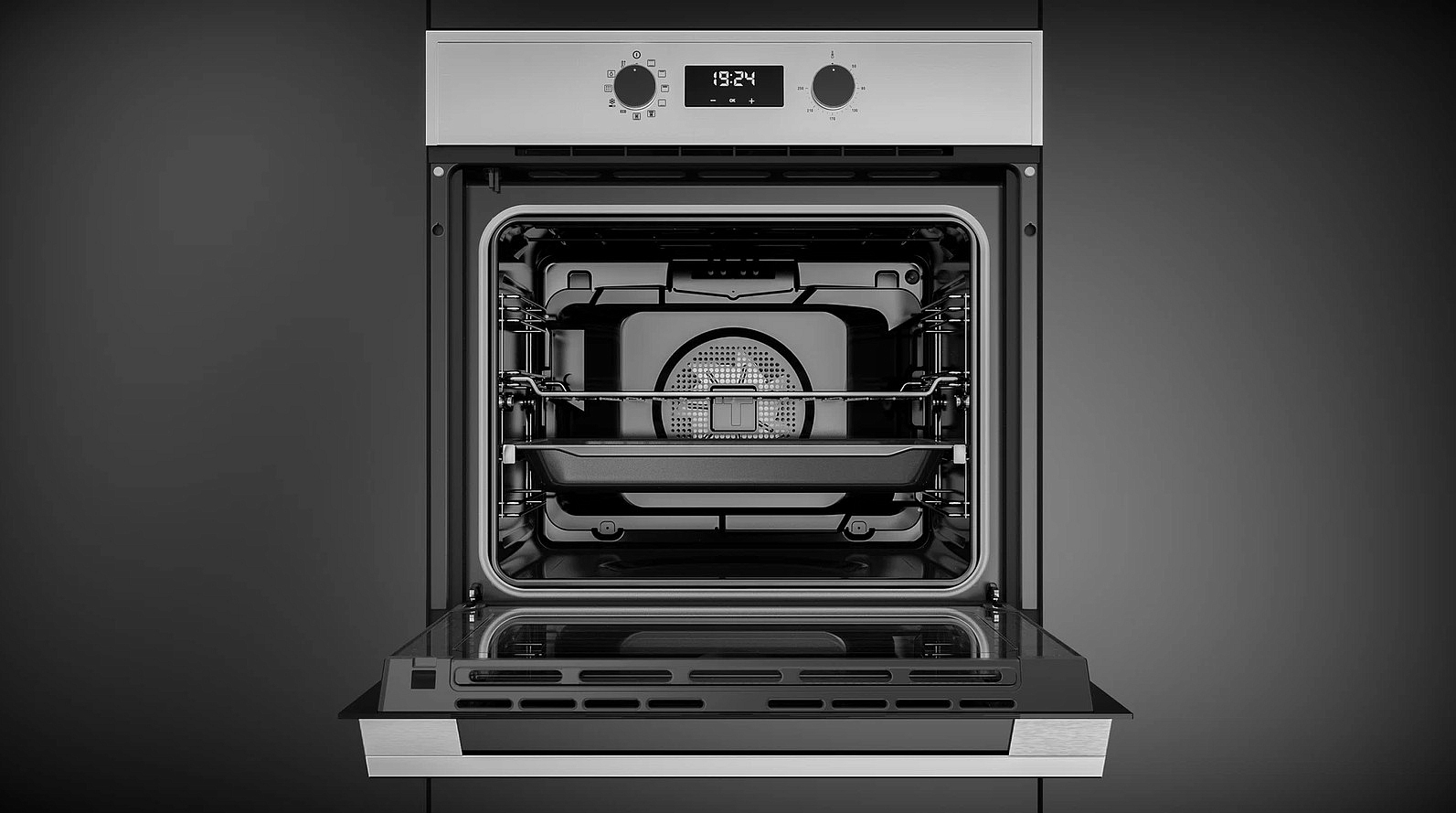Все функции и режимы работы духового шкафа легко контролировать с помощью электронного программатора и сенсорных поворотных переключателей. Цифровой дисплей и таймер обеспечивают удобство и простоту использования. Освещение внутри духового шкафа осуществляется одной лампой накаливания, что обеспечивает хорошую видимость во время приготовления пищи.